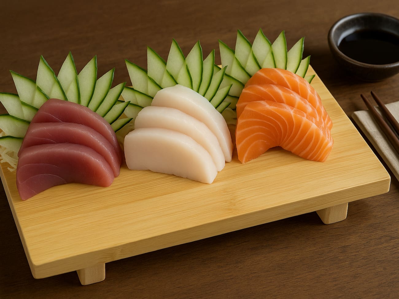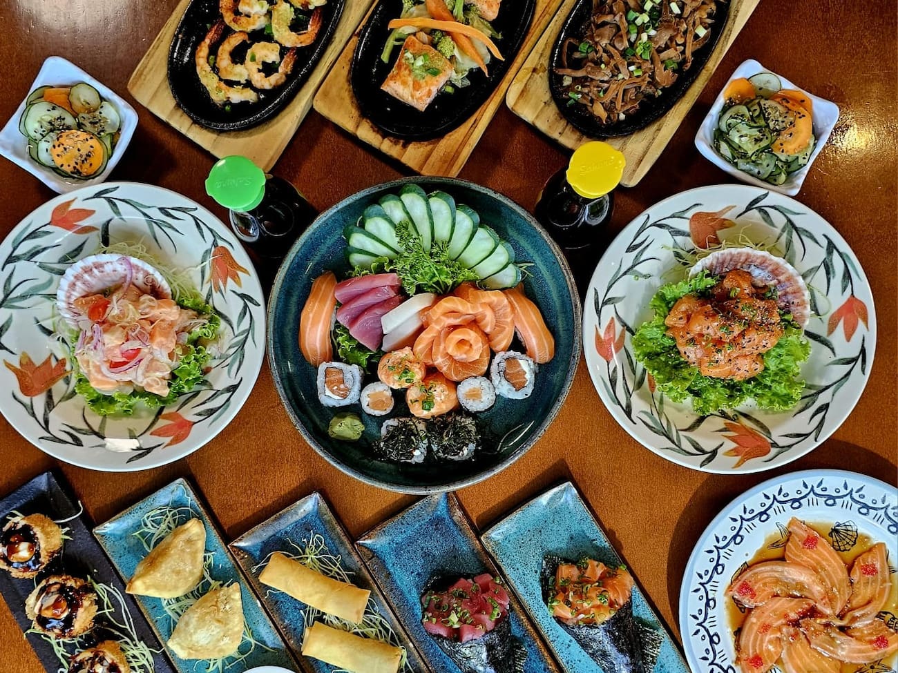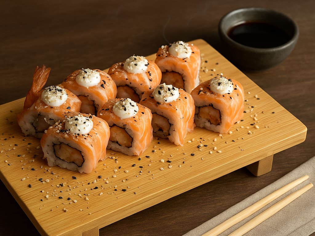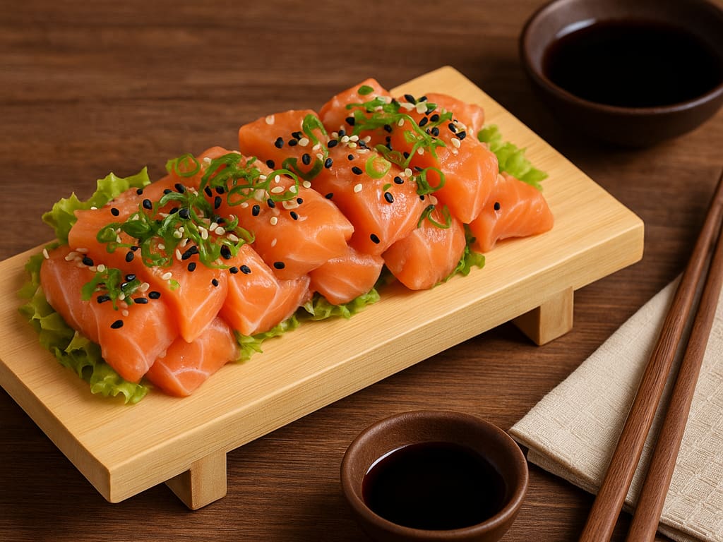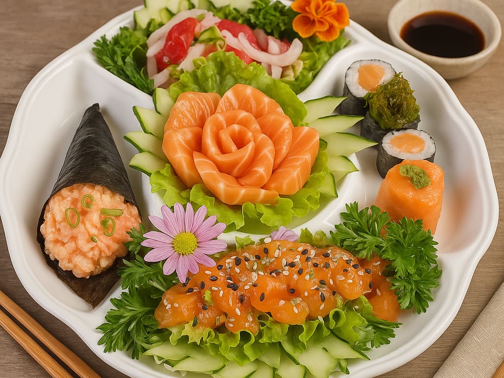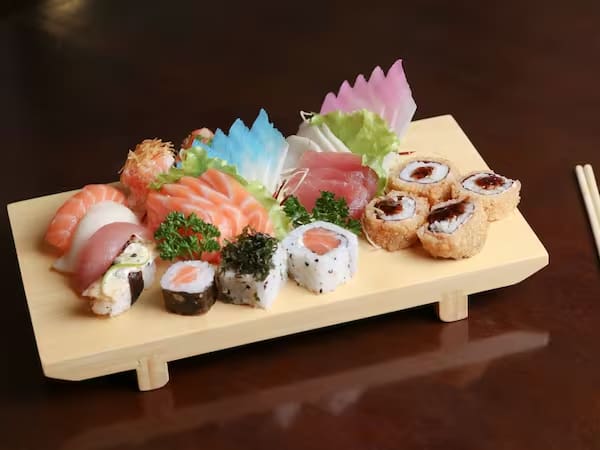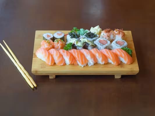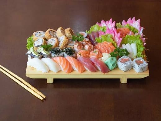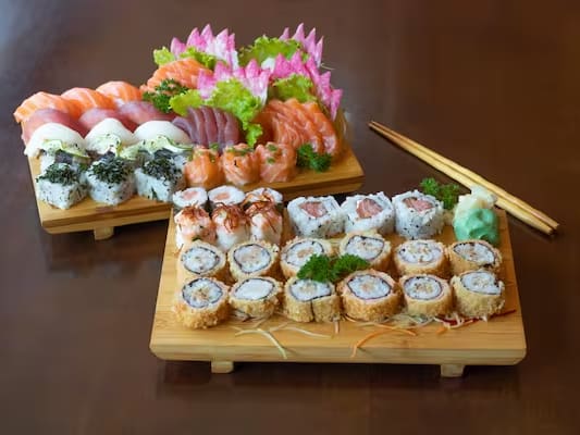 COMBINADO P/ 3 PESSOAS (60 PEÇAS)10 Sashimis de Salmão frescos e suculentos, 5 Sashimis de Atum, de sabor único e vibrante, 6 Sashimis de Peixe Branco delicados e saborosos, 3 Niguiris de Salmão, 3 Niguiris de Atum, 3 Niguiris de Peixe Branco, 3 Niguiris Skin crocantes, 3 Jhou de Salmão, 3 Uramakis de Salmão, 3 Uramakis Skin crocantes, 3 Bateras clássicos, 12 Hot Rolls de Salmão, crocantes e irresistíveis